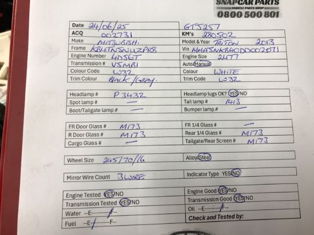 | Part | Vehicle Model | Type | Condition | |||||||||||